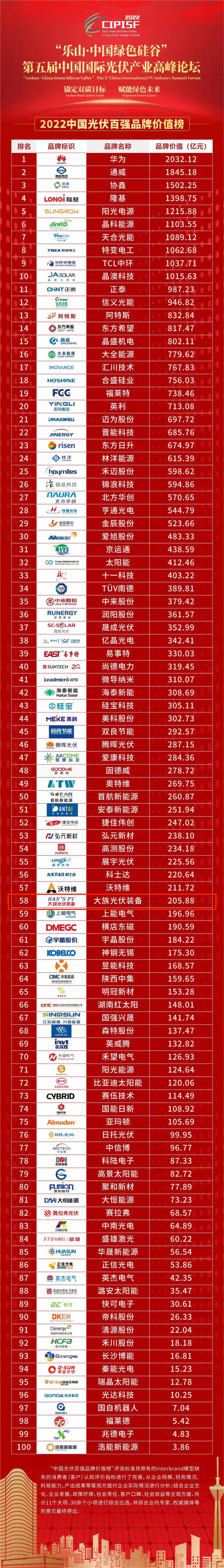26日,“金辰杯”CIPISF2022中國光伏百強品牌價值榜在大會上隆重揭曉,大族光伏裝備以205.88億的品牌價值成功入選2022年中國光伏百強品牌。