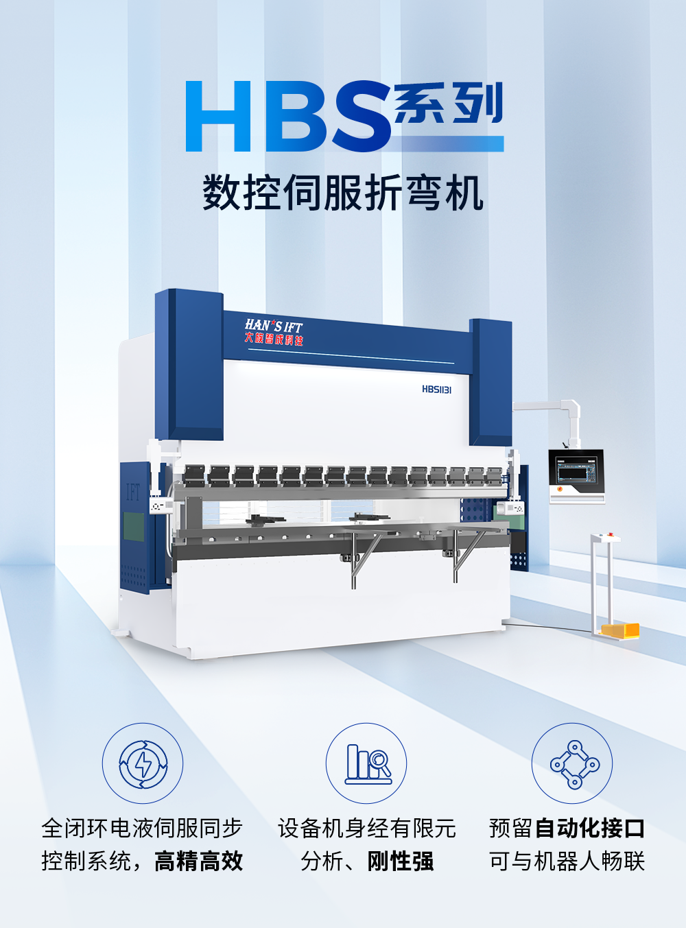 HBS系列設(shè)備預(yù)留自動化接口,可跟機(jī)器人自動折彎單元聯(lián)機(jī),實(shí)現(xiàn)全自動折彎成型,不需要人工配合,滿足對自動化生產(chǎn)的需求。