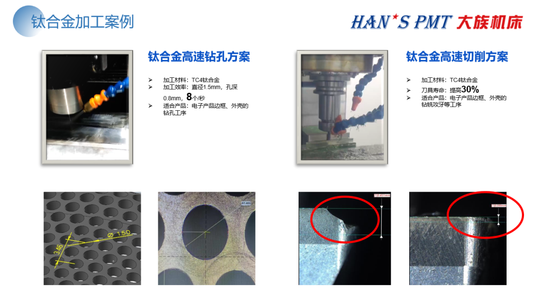 鄒工還重點講解了大族機(jī)床在鈦合金等熱點材料上的最新研究成果,鈦合金的加工良率和效率是目前3C廠商最大的痛點和難題之一,大族機(jī)床在鈦合金制程工藝上積極探索和研究,在CNC機(jī)型選擇、主軸和刀柄選型、刀具選型設(shè)計、結(jié)構(gòu)設(shè)計、加工方式等配置和設(shè)計上反復(fù)測試和驗證,結(jié)合切削液冷卻優(yōu)化、自適應(yīng)控制技術(shù)、刀具檢測及其他輔助工具等功能設(shè)置和優(yōu)化,對于典型難加工材料——鈦合金等工業(yè)零部件,可實現(xiàn)較為高效、成熟的數(shù)控加工解決方案,并已成功實現(xiàn)量產(chǎn)。